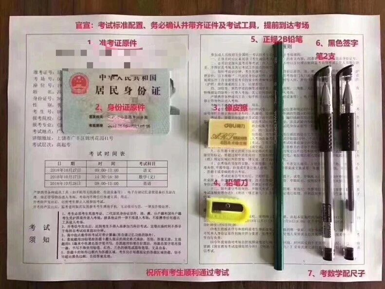 准考证以及本人有效身份证,这个一定要带,一定要带,一定要带!没有准考证,你连考场都进不去!还没打印准考证的同学尽快打印,建议可以提前多准备几份,分开放在不同位置,防止临时找不到。