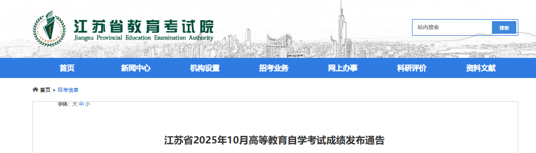江苏省高等教育自学考试2025年10月成绩将于11月20日上午10:00发布,考生可登录江苏省教育考试院门户网站(www.jseea.cn)“招考业务”栏目“自学考试”页面查询考试成绩。