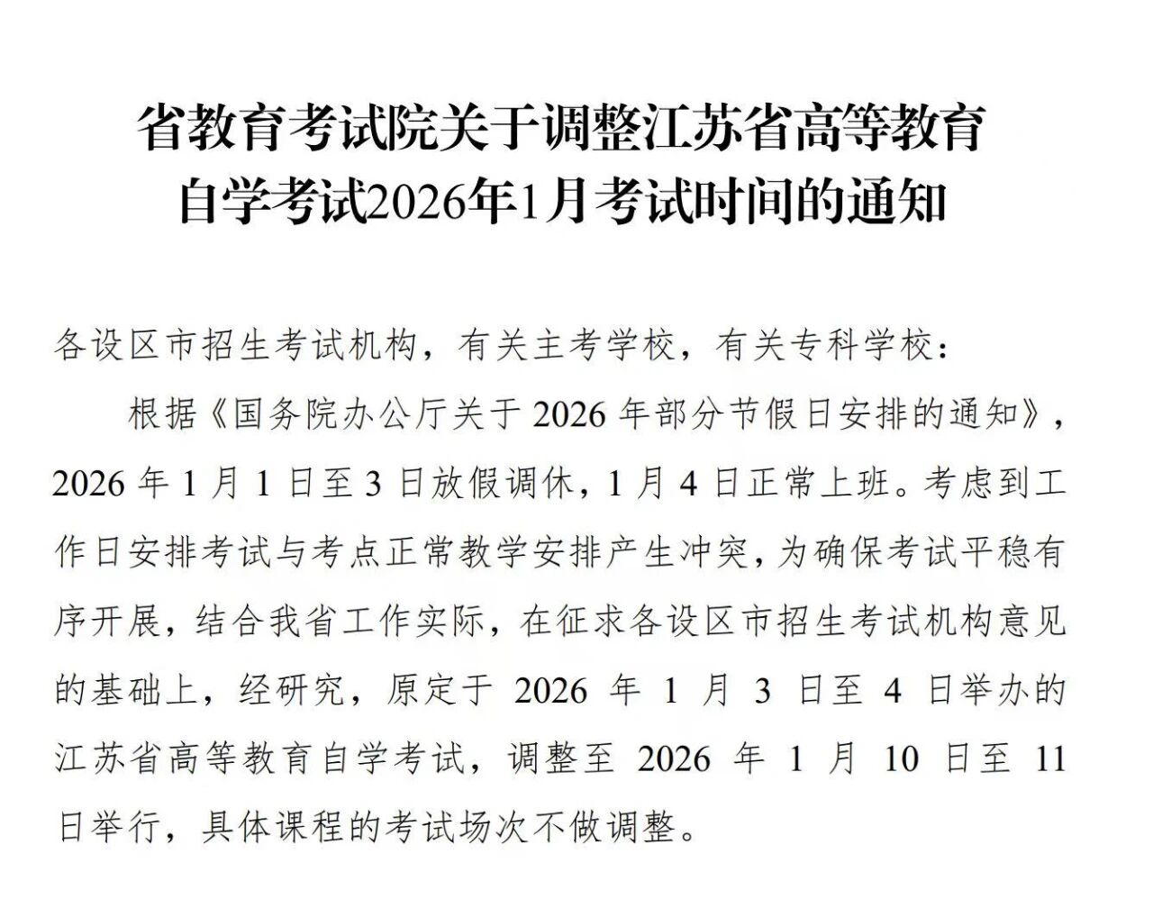 江苏省教育考试院公布了关于调整江苏省高等教育自学考试2026年1月考试时间的通知!