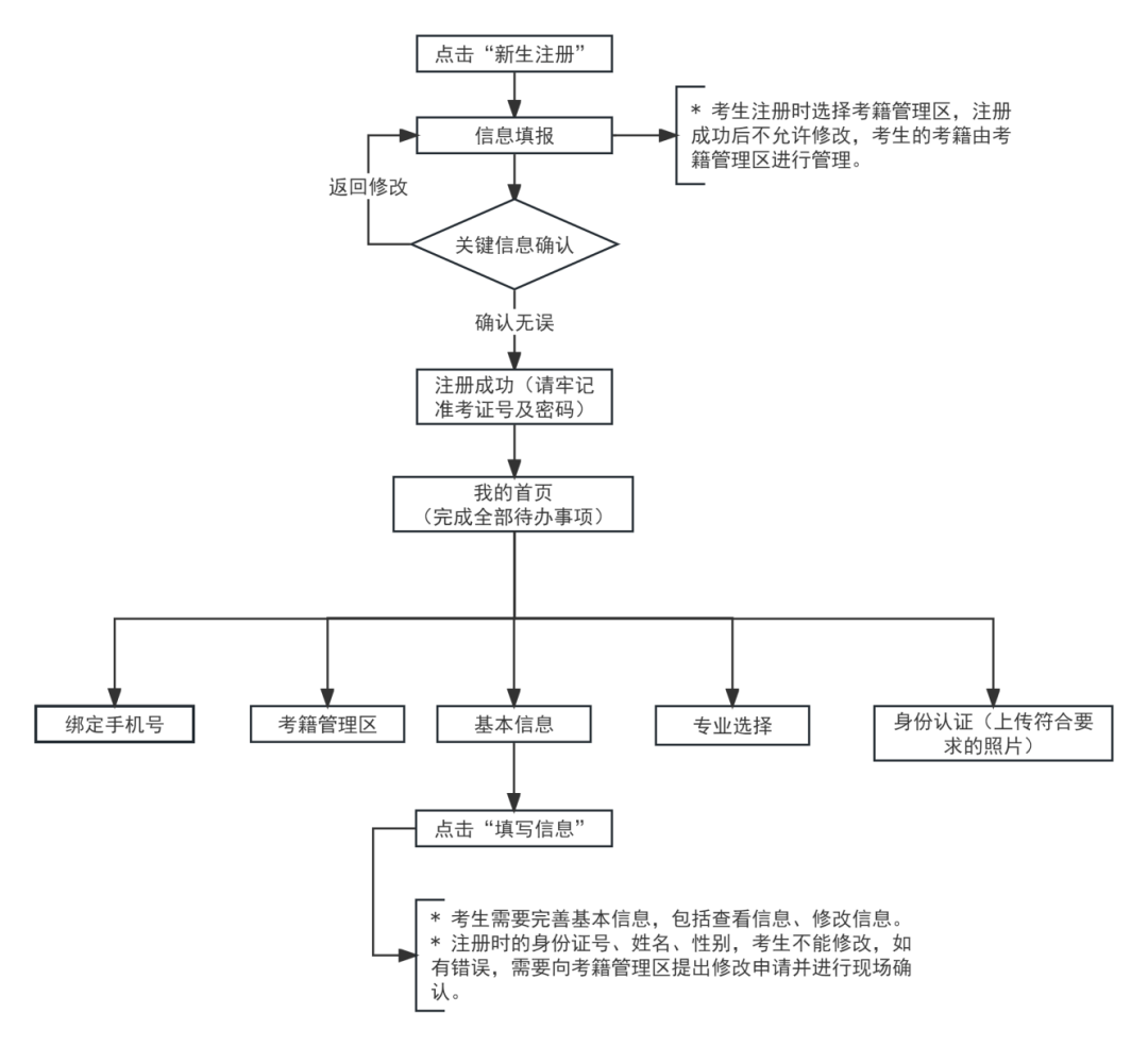 (3)考生须如实填报各项基本信息,请确保手机号码、通讯地址等信息准确无误,身份证号、姓名、性别等关键信息如有错误,考生个人不能修改,须联系考籍所属考区提出申请并进行现场确认。