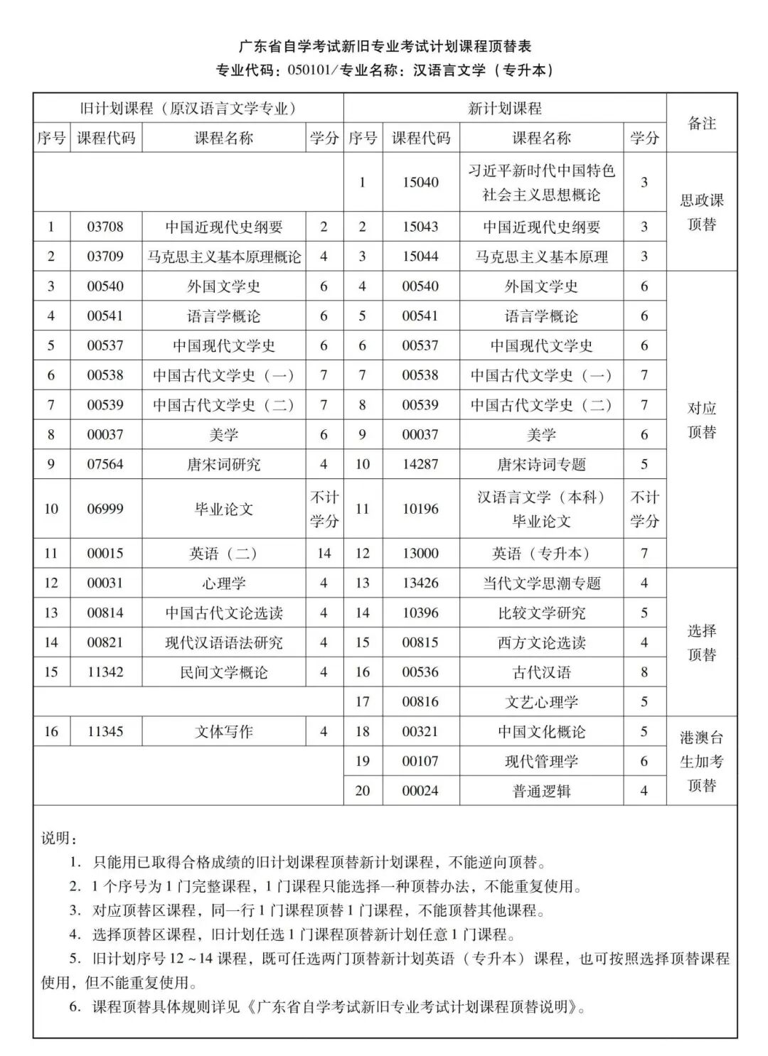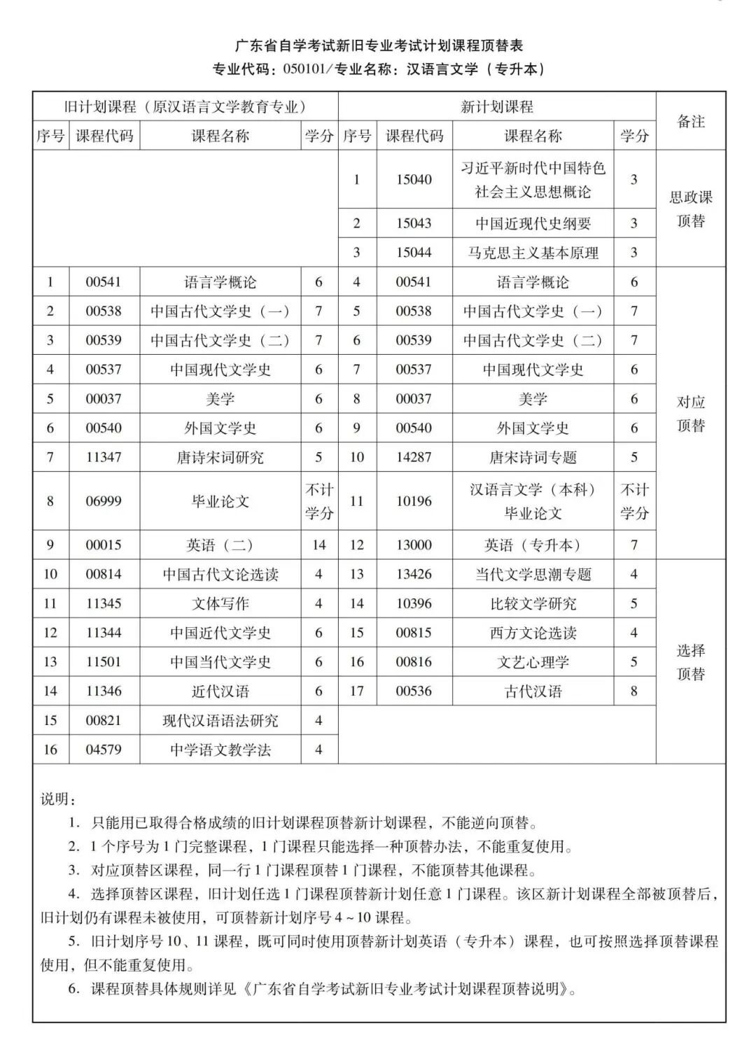 例如“汉语言文学(专业代码:050101)”专业,包含“汉语言文学”和“汉语言文学教育”两个专业考试计划,课程顶替关系不能跨专业考试计划使用,只能按《顶替表》中各自的顶替办法使用。