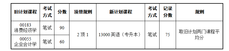 一、旧计划两门笔试课程顶替新计划一门笔试课程的,新计划课程成绩记录为旧计划两门课程的平均分数。举例如下:
