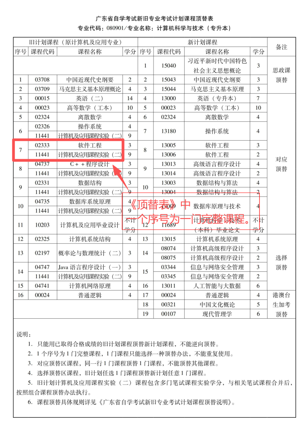 3、一个专业或一个专业考试计划内一门完整课程有两种及以上顶替办法的,只能选择其中一种,不能重复使用。《顶替表》中一个序号为一门完整课程。如下:
