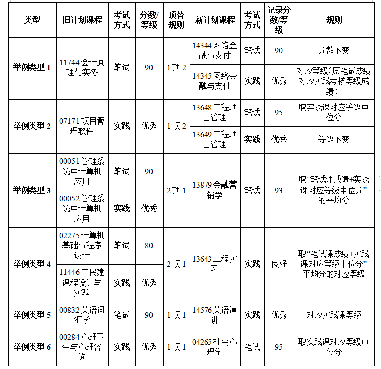 二、新旧计划顶替课程考试方式不一致的6种类型,举例如下: