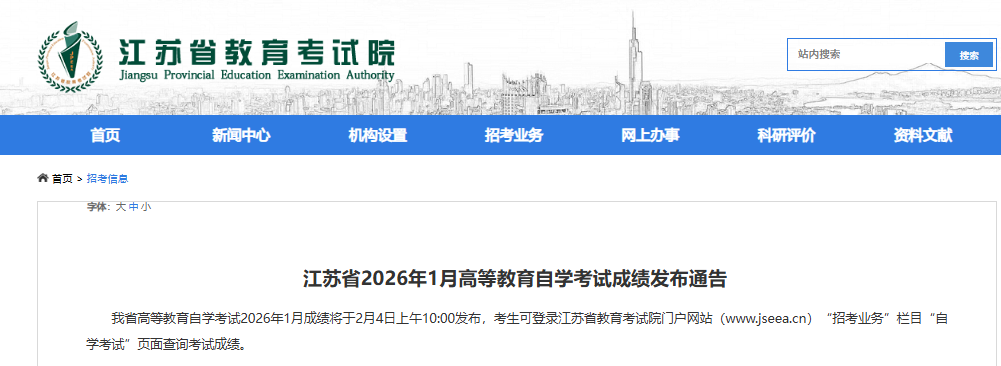 我省高等教育自学考试2026年1月成绩将于2月4日上午10:00发布,考生可登录江苏省教育考试院门户网站(www.jseea.cn)“招考业务”栏目“自学考试”页面查询考试成绩。