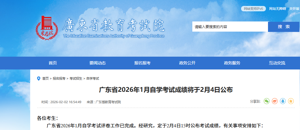 广东省2026年1月自学考试评卷工作已完成。经研究,定于2月4日15时公布考试成绩,有关事项安排如下: