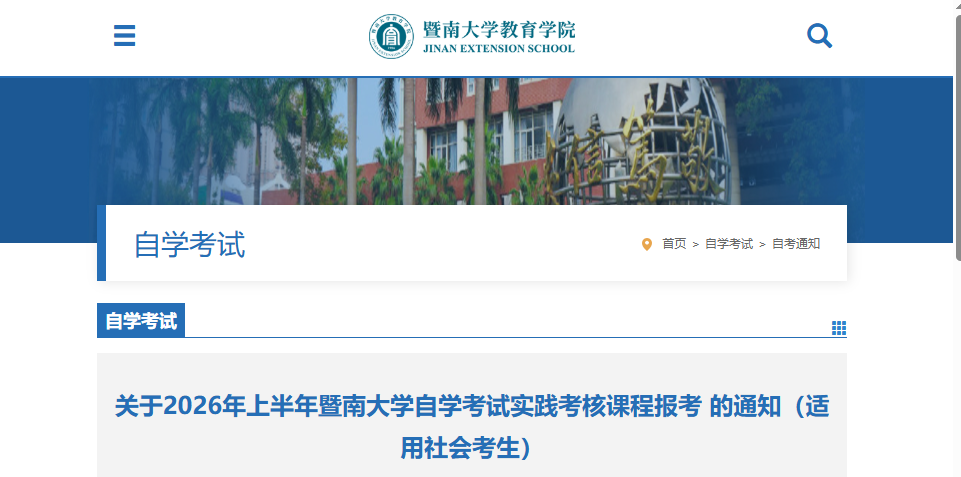 关于2026年上半年暨南大学自学考试实践考核课程报考 的通知(适用社会考生)