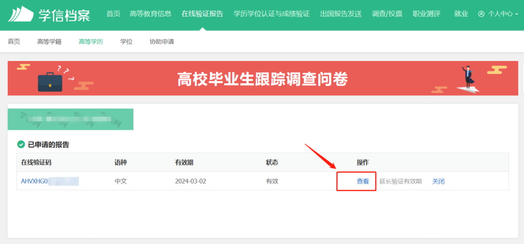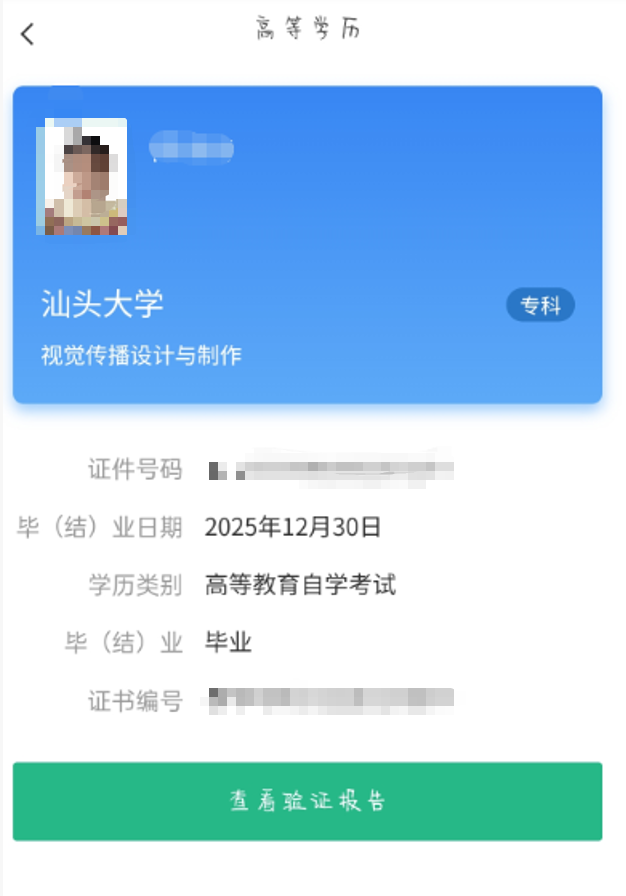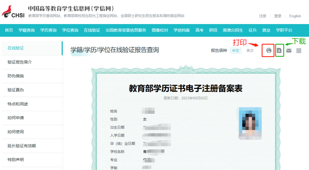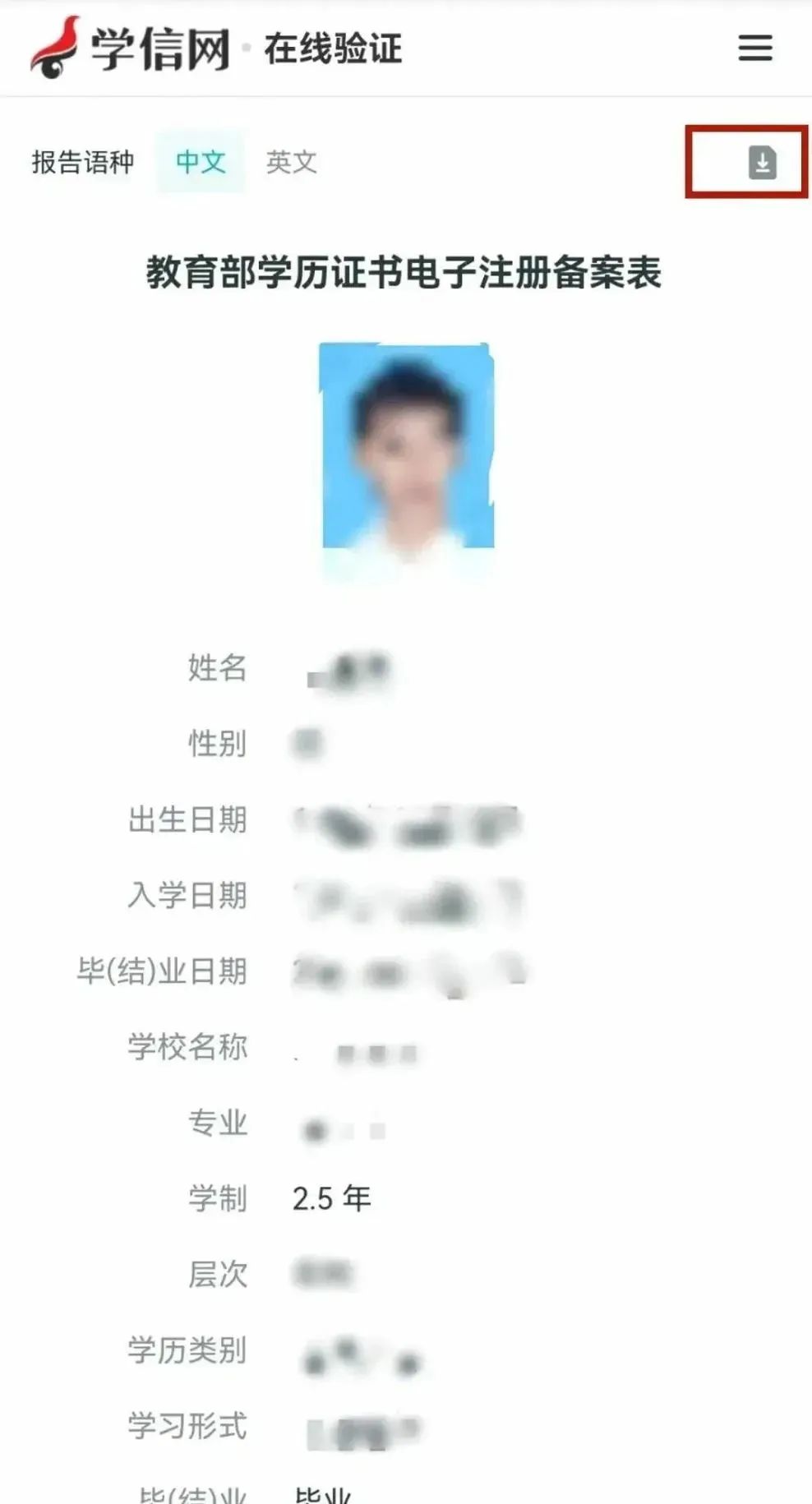 点击查看【中国高等教育学位在线验证报告】,可下载学位验证报告。
