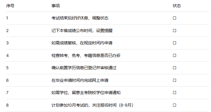 但考后并不是直接“躺平”等拿证——从成绩公布到毕业申请,中间还有好几个关键节点需要关注。今天就帮大家把4月考后到毕业拿证的全流程梳理清楚,附上一份考后自查清单,建议收藏!