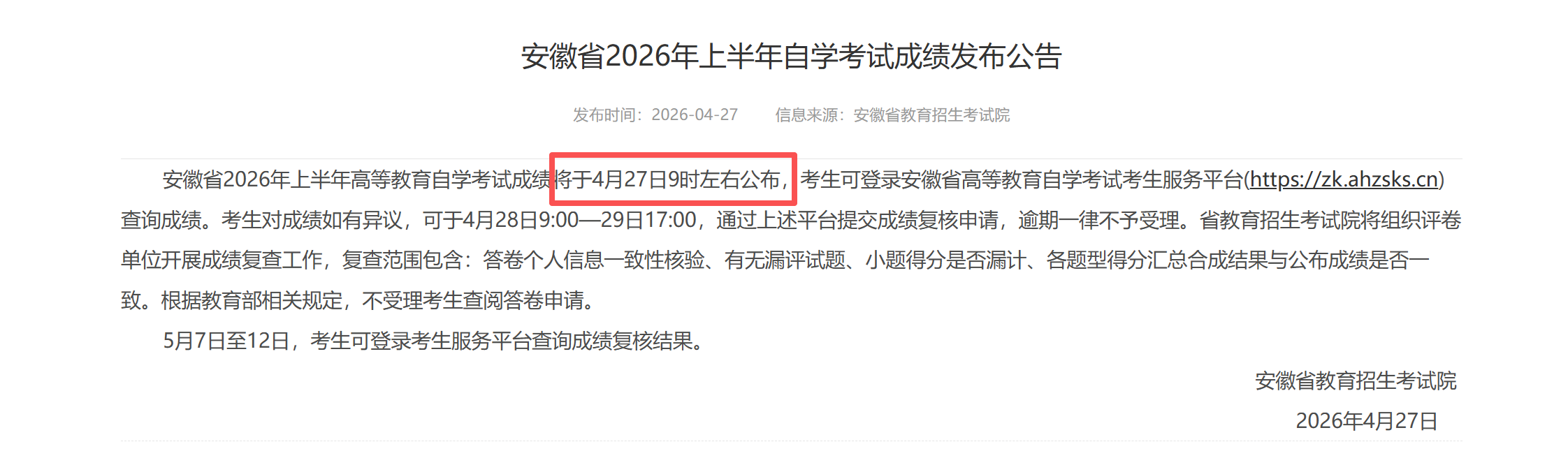 安徽省2026年上半年高等教育自学考试成绩将于4月27日9时左右公布,考生可登录安徽省高等教育自学考试考生服务平台(https://zk.ahzsks.cn)查询成绩,考生对成绩如有异议,可于4月28日9:00一29日17:00,通过上述平台提交成绩复核申请,逾期一律不予受理。省教育招生考试院将组织评卷单位开展成绩复查工作,复查范围包含:答卷个人信息一致性亥验、有无漏评试题、小题得分是否漏计、各题型得分汇总合成结果与公布成绩是否一致。根据教育部相关规定,不受理考生查阅答卷申请。