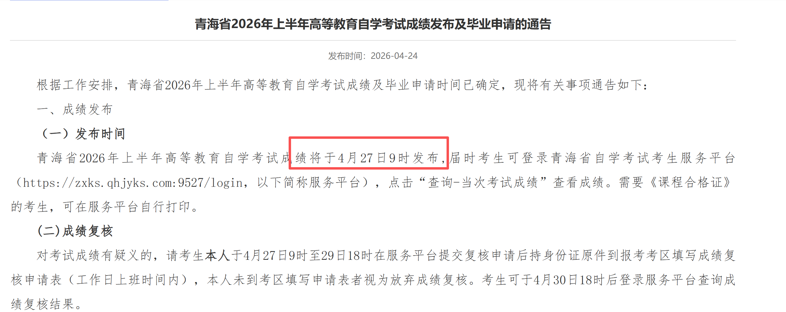 青海省2026年上半年高等教育自学考试成绩将于4月27日9时发布届时考生可登录青海省自学考试考生服务平台(https://zxks. qhjyks.com: 9527/login, 以下简称服务平台),点击“查询-当次考试成绩”查看成绩。要《课程合格证》的考生,可在服务平台自行打印。