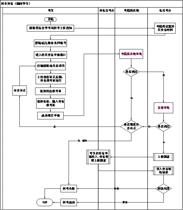 2.考生在规定时间内登录考生服务平台申请转入,考籍所在地对考生的转入申请进行审核,审核内容包括考生的基本信息、电子相片、课程成绩及笔迹卡等,审核通过后由省教育考试院自考办集中办理,办理流程见附件3。