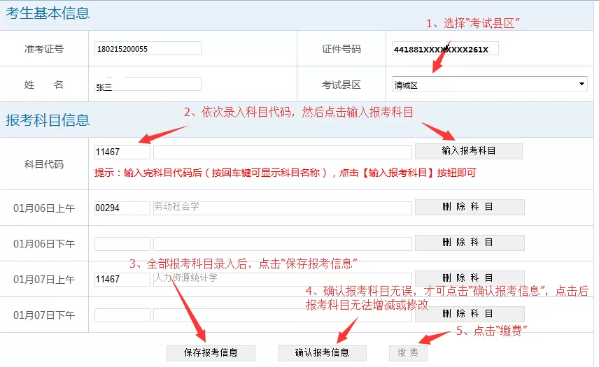 📋第三步:选择“考试区县”输入报考科目,保存报考信息,确认报考信息