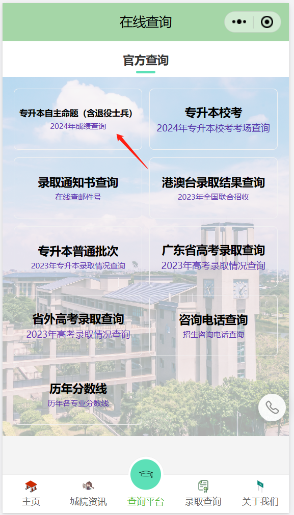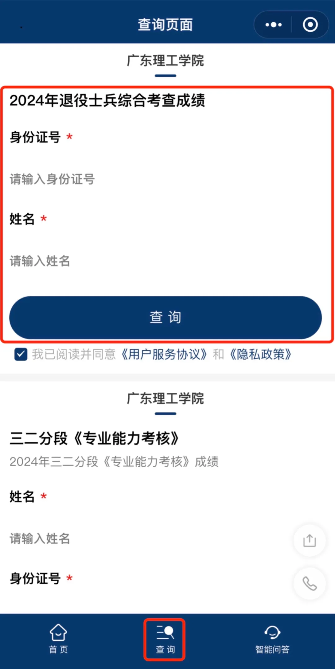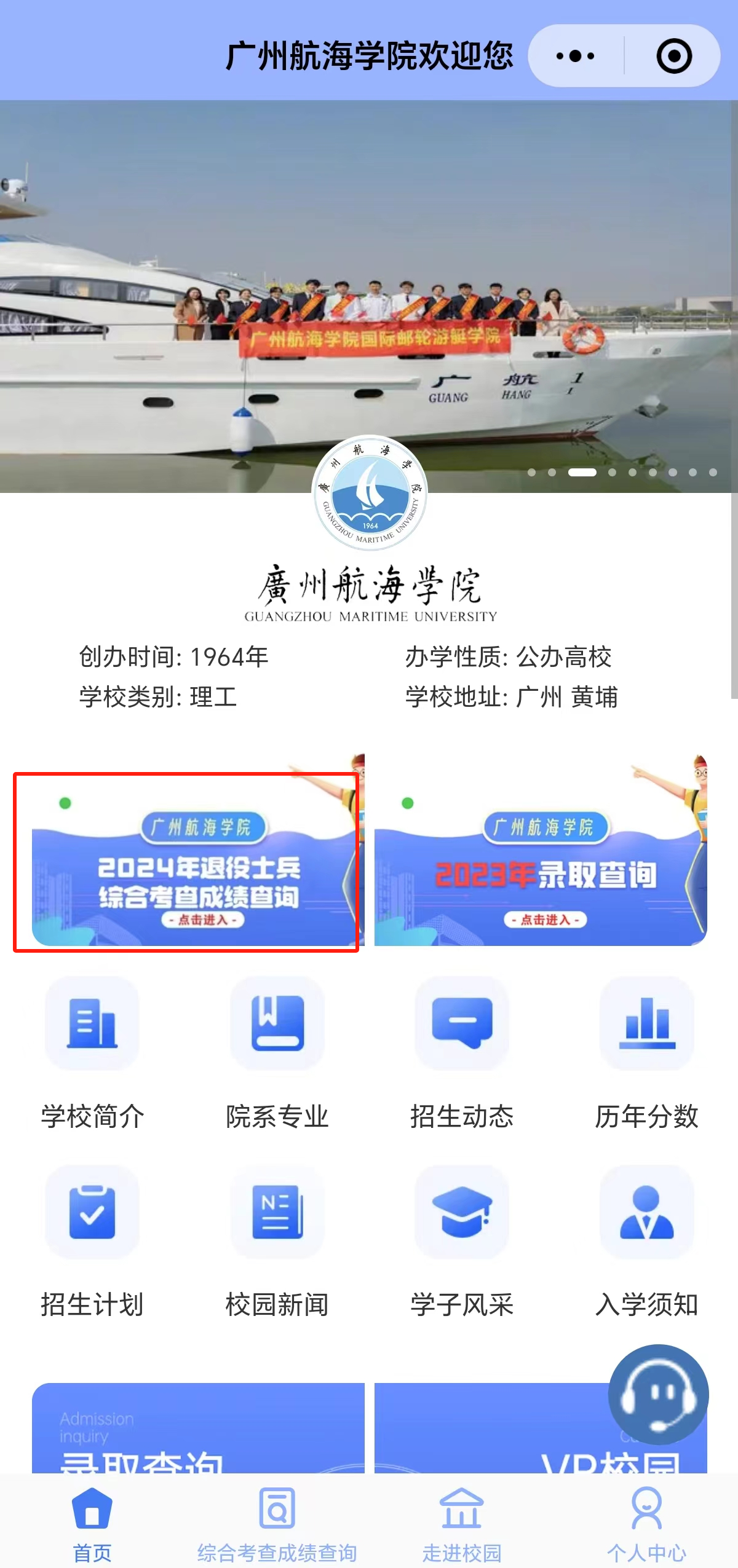 微信搜索“广州航海学院本科招生”小程序,点击“退役士兵综合考查成绩查询”