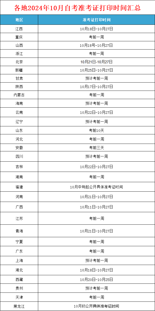 距离10月自考仅剩35天,目前仅剩3省可以报考。 ▼ 大自考太难直接转小自考轻松考过 小自考只需统考3科,最快1.5年考完 ↓扫码去登记报名信息↓ 今天汇总了24年10月自考各地准考证打印时间,快来看看吧~仅供大家参考,具体以当地考试院最新出的公告为主~ 准考证是参加自考考试的重要证件之一,大家打印时一定要确认信息是否显示正确,如果有问题及时联系当地自考办。