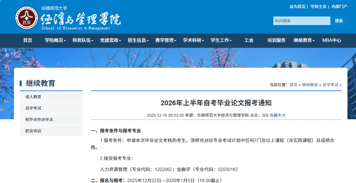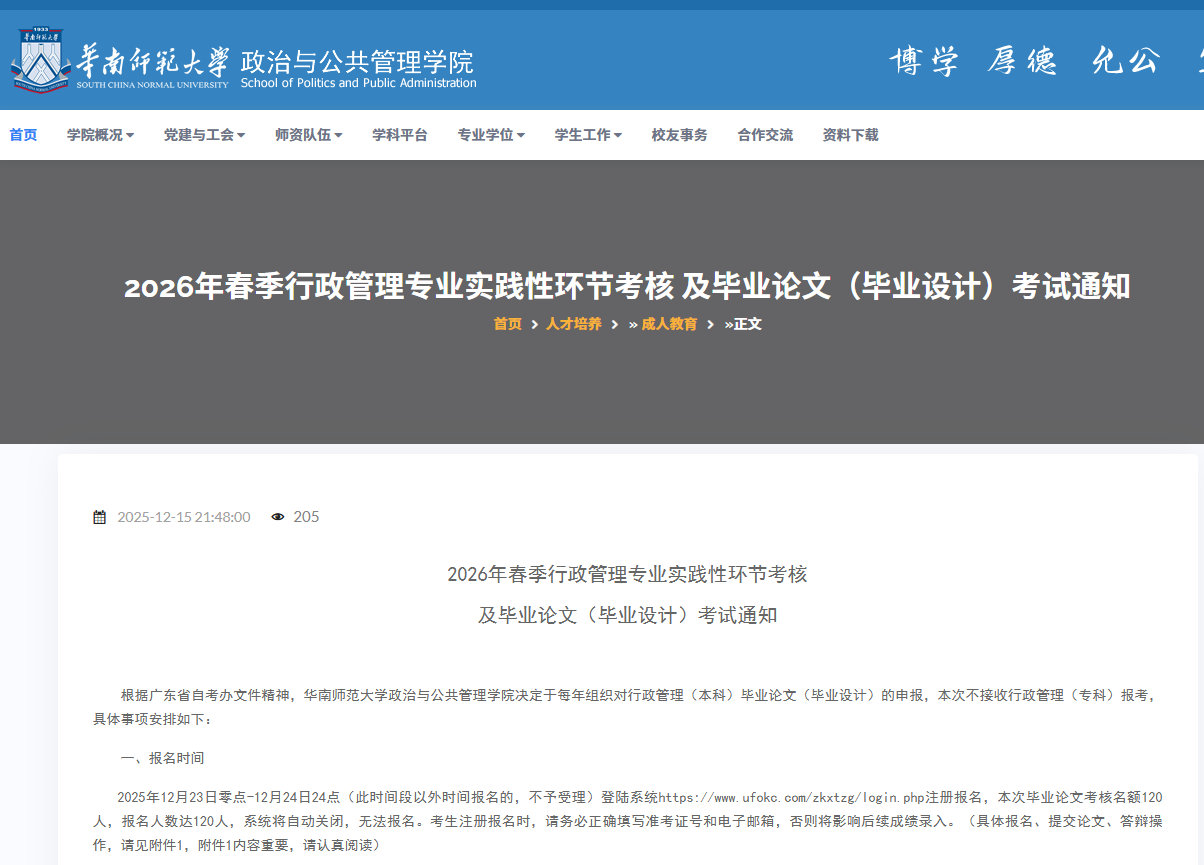 *各位考生注意,我院毕业论文报名、终稿提交和答辩全程在华南师范大学政治与公共管理学院论文系统中完成,所有通知请密切关注论文系统中通知栏各个阶段提醒通知,不会另外发短信或邮件;如论文系统出现无法登录,可浏览我院官网“人才培养-成人教育”栏查看相关网络处理通知。我办自考社会考生毕业论文唯一咨询电话:020-39310317,其他电话号码无法咨询。