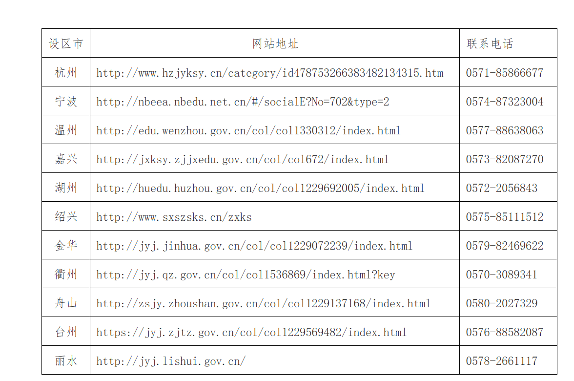 5.请考生务必关注报考地所属设区市教育考试机构网站,及时了解相关信息。各设区市教育考试机构网站地址及联系电话如下: