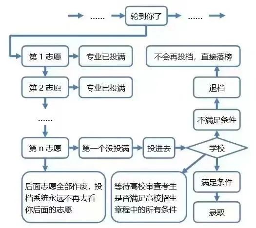 分数优先,遵循志愿:就是说你报了这个学校的专业,学校将根据我们的成绩,从高到低分进行排列,再根据我们填的专业,按照成绩再进行一次排名,院校从高到低进行择优录取,录取名额一满,剩下考生名额将会退到另一个录取批次中。