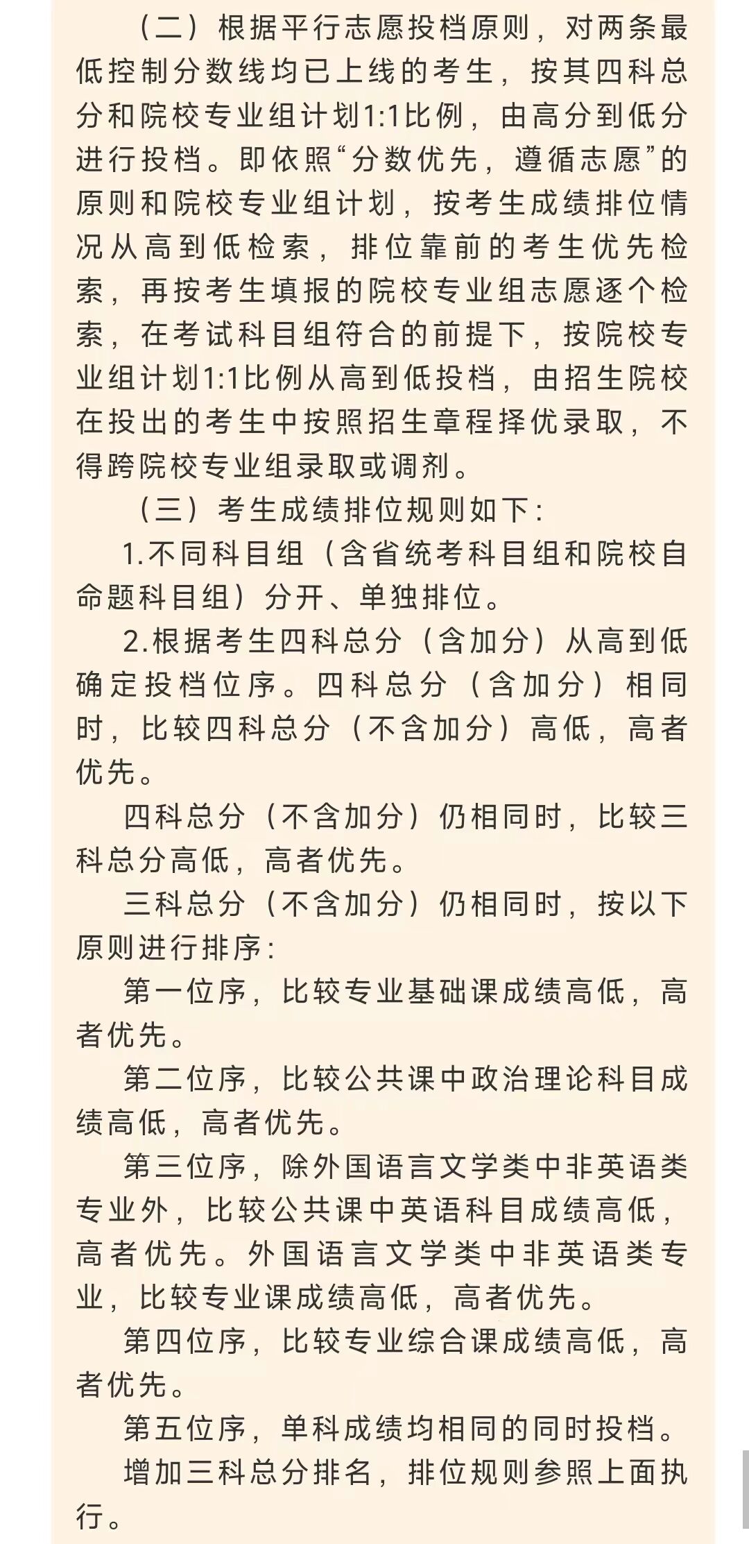 补录依据三科总分投档,招生院校按照招生简章公布的录取规则择优录取。招生院校自命题的专业综合课的专业,可由招生院校自行决定是否参加补录,并在招生简章中明确,也是依据三科总分投档。