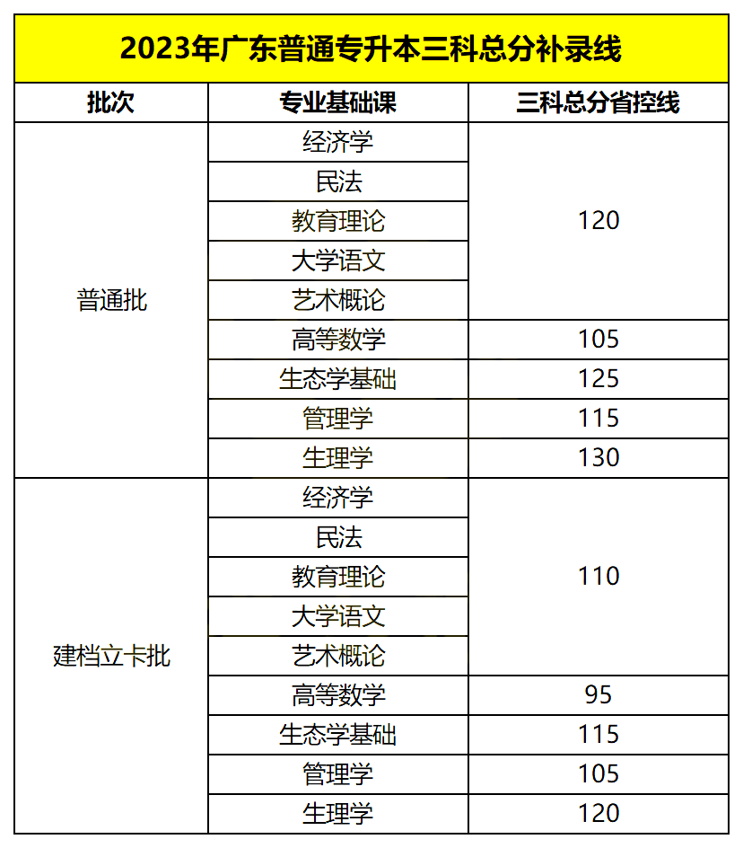 补录分数线划分:按考生类别(职教师资、建档立卡考生、普通考生)、专业基础课分别划定三科总分(2门公共课+1门专业基础课,外国语言文学类中非英语类专业为1门公共课+1门专业基础课+1门专业课)和专业综合课两条最低控制分数线。