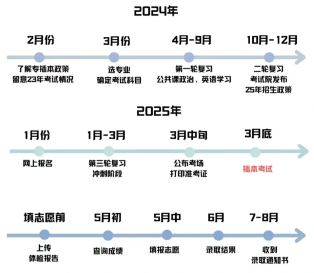 建议以下这种情况,最好提前一年备考:① 目标为公办院校;② 跨专业;③ 学习基础差。2025年专插本的大致流程如图: