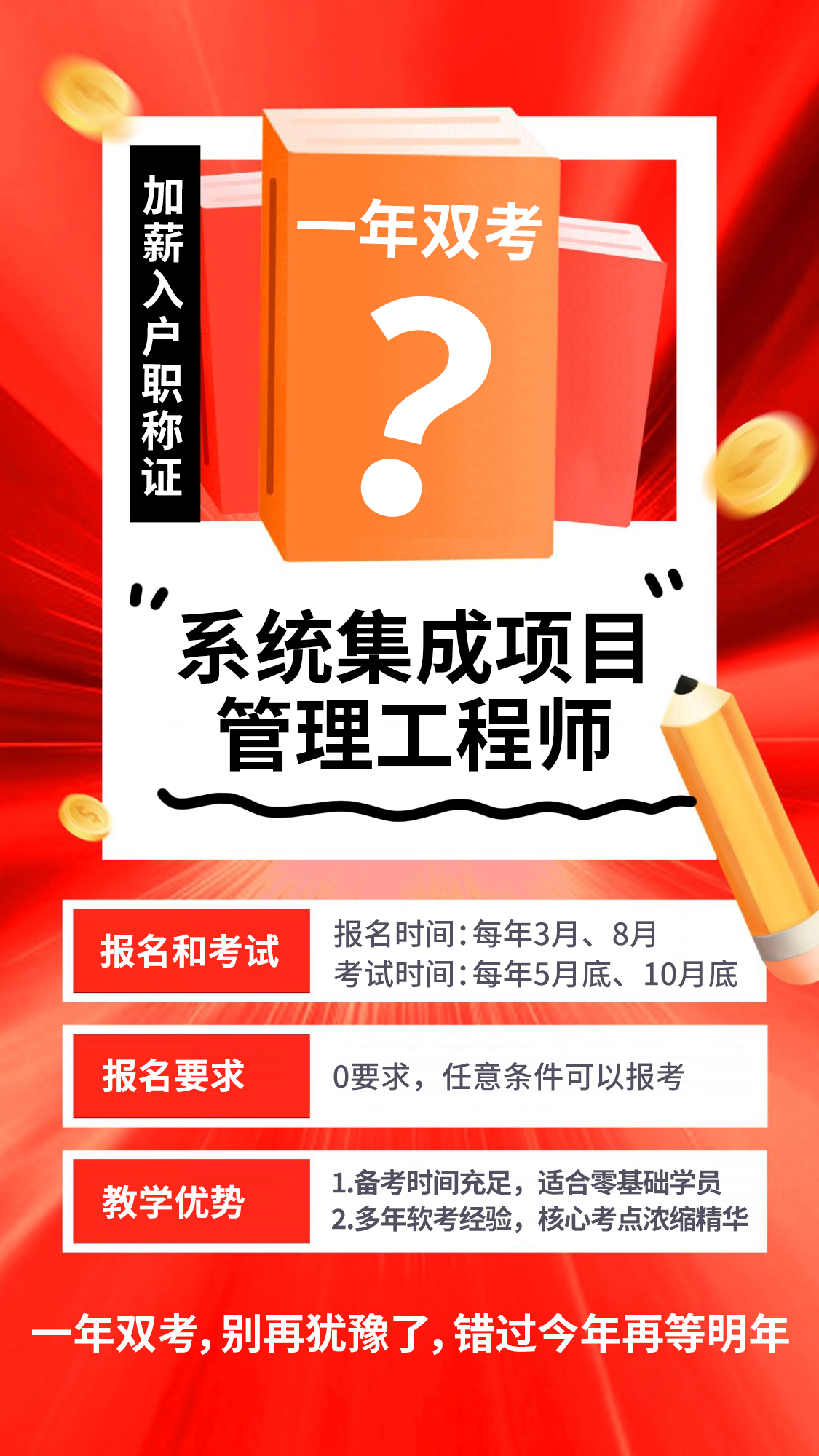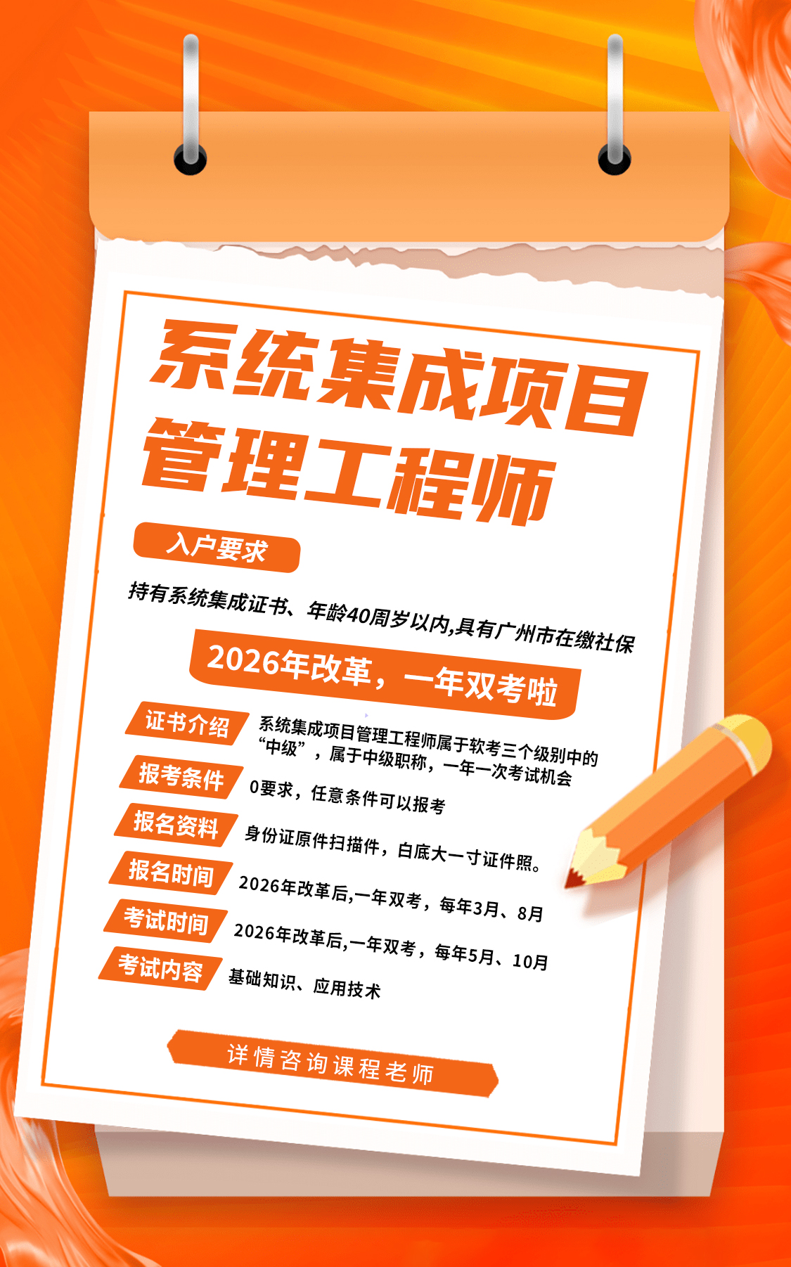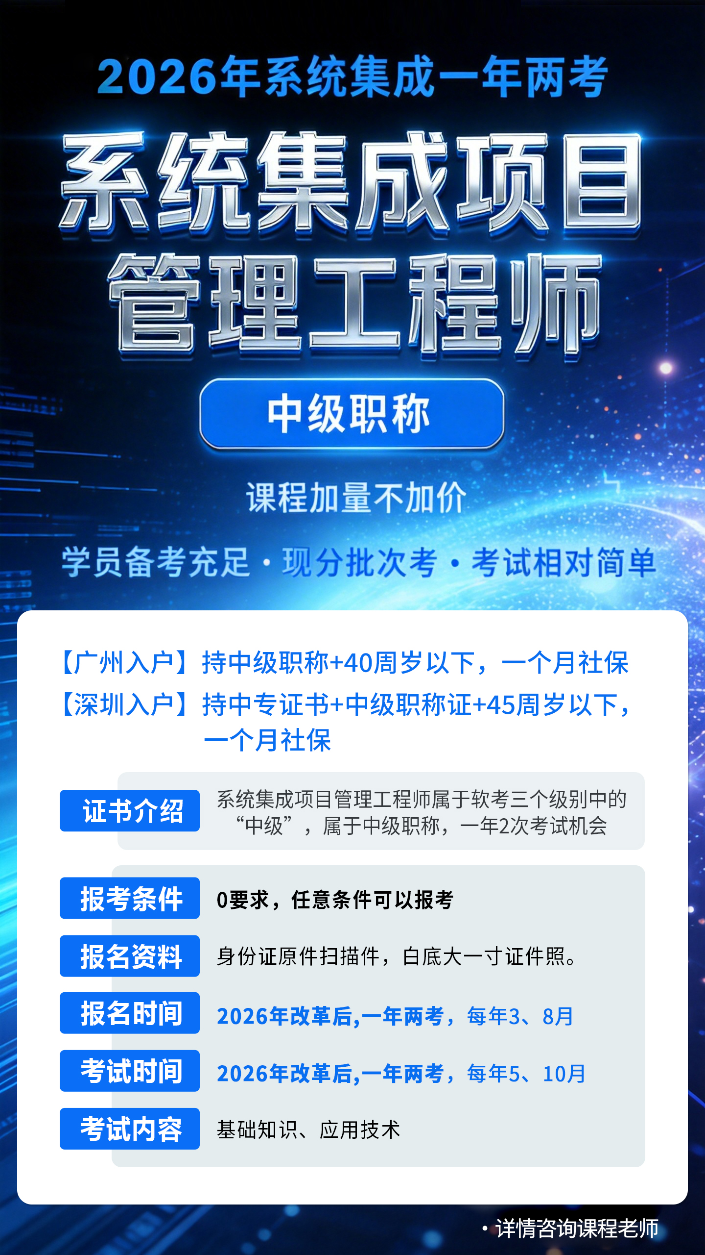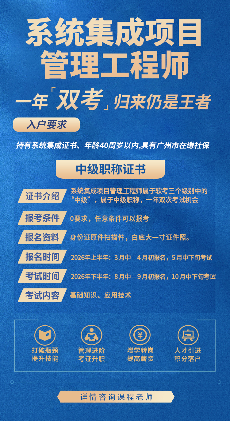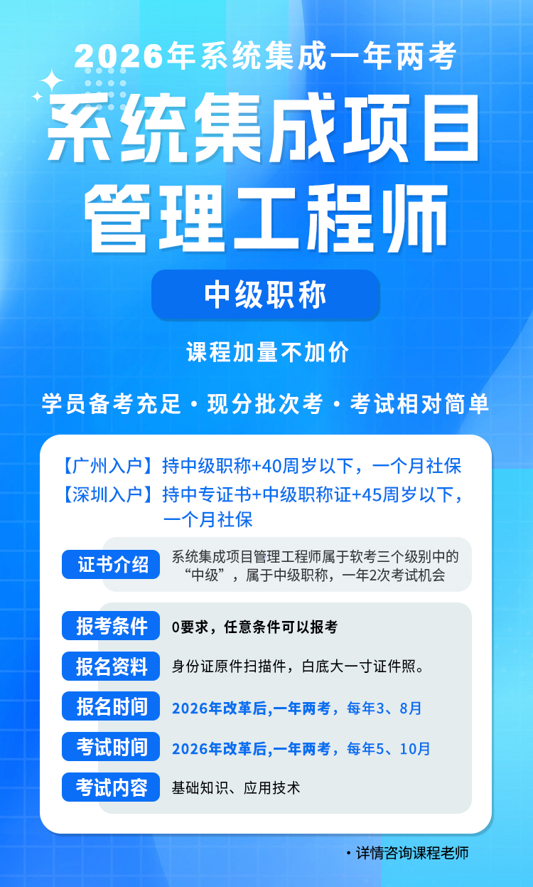 系统集成项目管理工程师是工信部和人社部举办的软考中开设的一门中级职称考试。软考全称全国计算机技术与软件专业技术资格(水平)考试,系统集成项目管理工程师分属该考试“信息系统”专业,属于中级职称。证书常用于人才引进广州、深圳、上海等一线城市,也可以用于国企、事业单位评定职称、招投标资质等,每年几十万人报考,含金量高。