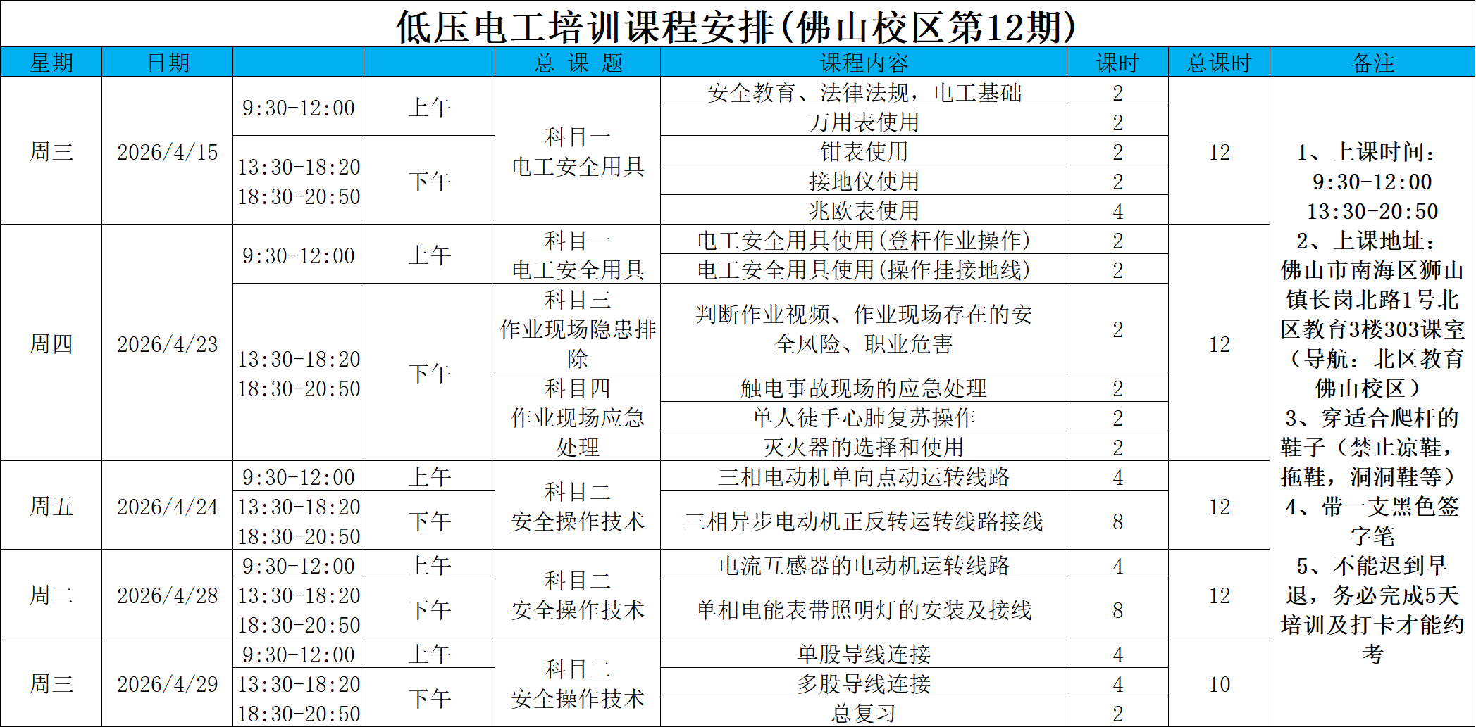 26年低压12期:4月15号开课。(南海狮山)