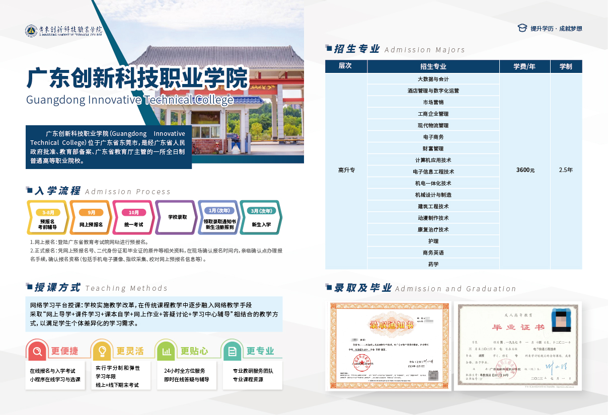 广东创新科技职业学院成立于 2011年,是一所经广东省人民政府批准、教育部备案,由广东省教育厅主管的全日制普通高等职业院校。学校下设信息工程学院、智能制造学院、建筑与设计学院、医药健康学院、经济管理学院、人文教育学院、马克思主义学院及中职部等8个二级学院,开设70个专业。