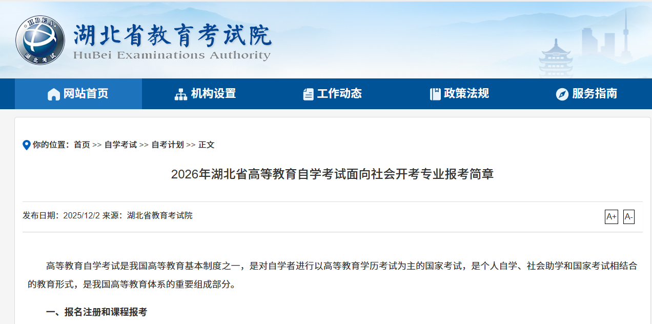 2026年湖北省高等教育自学考试面向社会开考专业报考简章