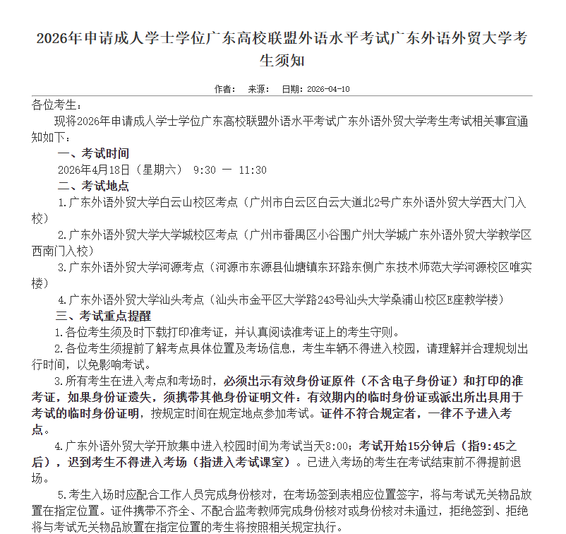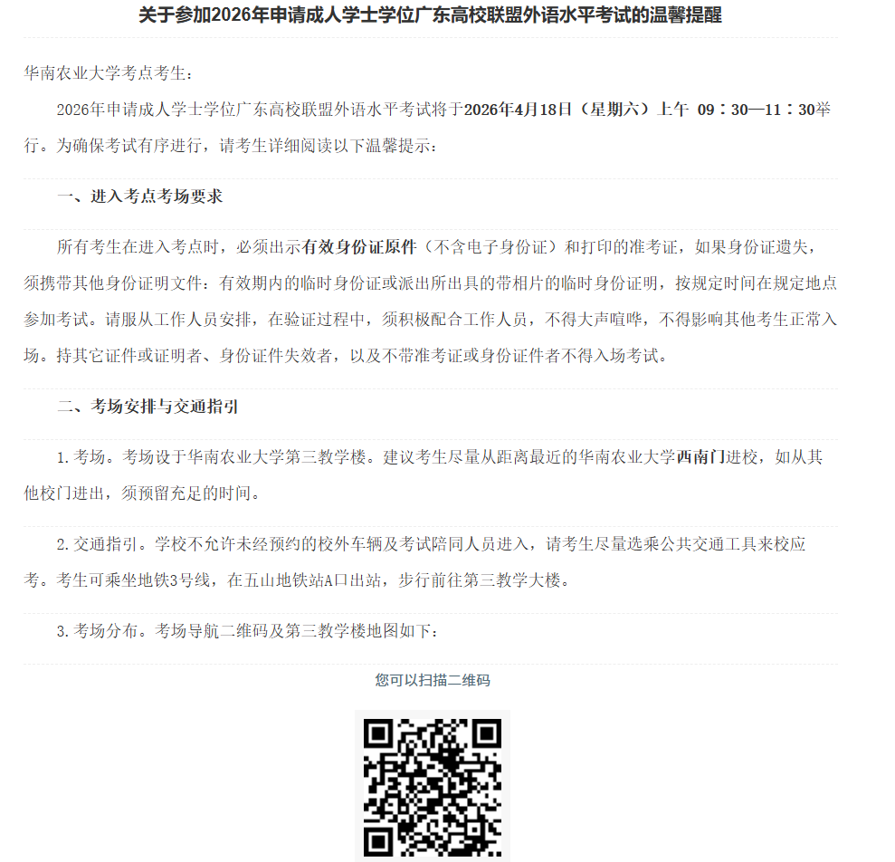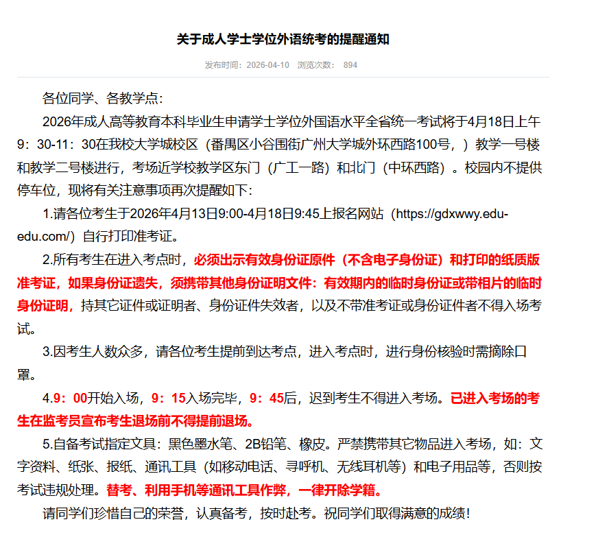 广东自考联盟学位英语考试时间:4月18日(星期六)9:30-11:30。