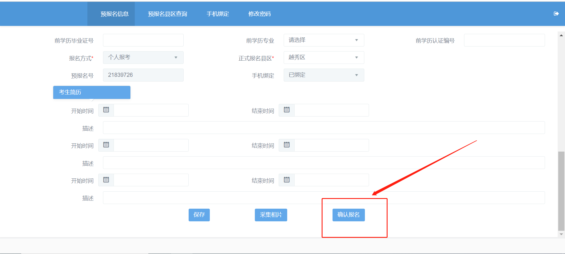 当审核通过后,在系统找到“确认报名”按钮,并点击即可。请记住系统弹出来的考生号。