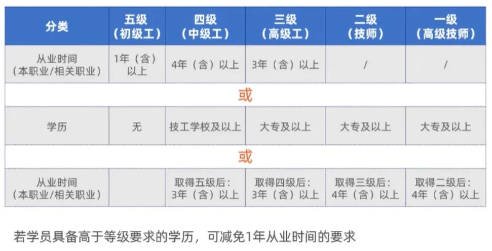 5)取得本职业或相关职业四级/中级工职业资格(职业技能等级)证书,并取得高等职业学校、专科及以上普通高等学校本专业或相关专业毕业证书(含在读应届毕业生)。