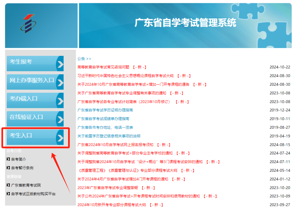 新生通过广东省自学考试管理系统(网址:https://www.eeagd.edu.cn/selfec/,下同),从【考生入口】通道进行预报名。