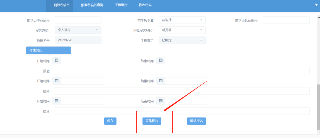 ➢考生预报名成功后还须完成本人手机绑定及相片采集且审核通过后(考生须在报名截止时间前提前自行查看相片审核结果)才能进行正式报名。