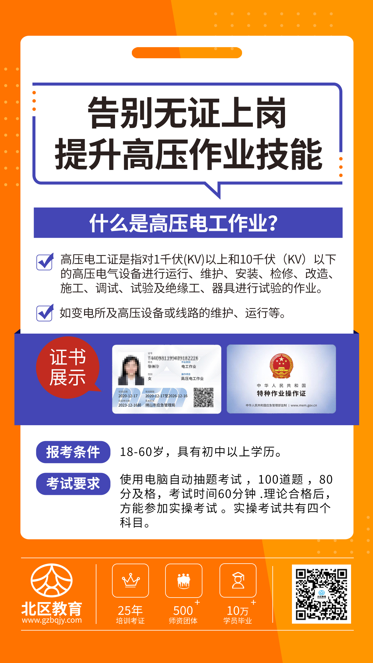 实操培训:必须经过线下实操培训,培训时间5~8天左右,每个工种不一样,具体课程安排见各校区课表,课表每月更新,额满即止。如有学员报名,请找我们拿离学员最近校区最新的课表。培训内容为考试内容,务必完整参加。